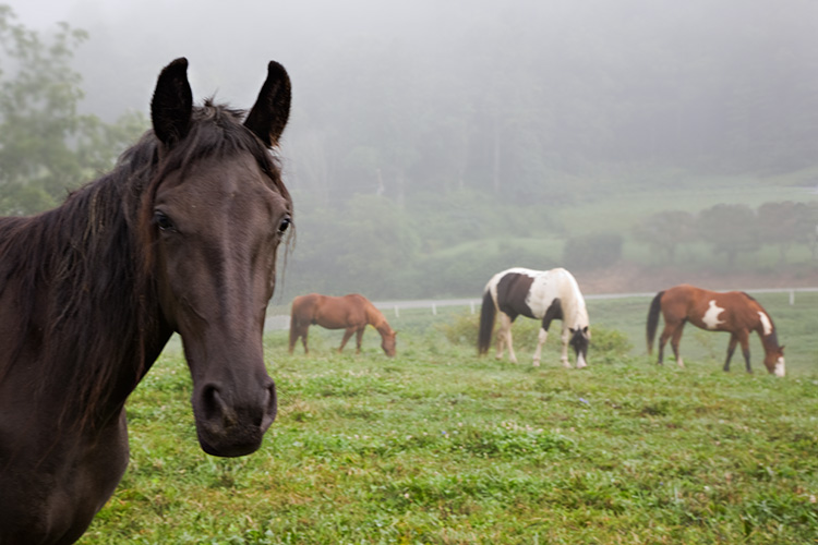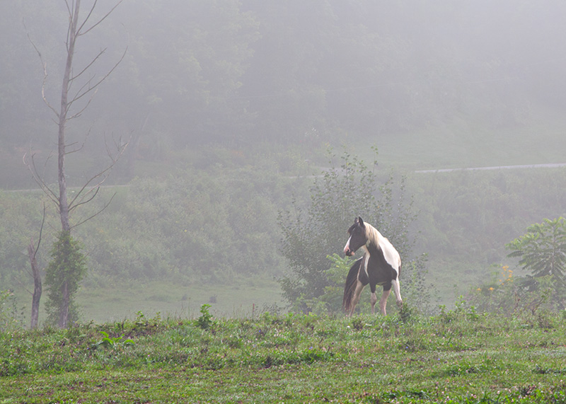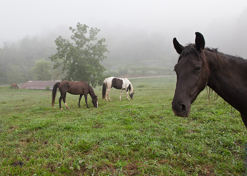 These next three horse photos were more deliberate. A friend of mine told me about them and how to get onto the gravel road behind the pasture. I went there on a misty August morning ready to be disappointed but also hoping to capture something more interesting than the usual grazing behavior.