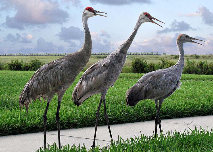 ** Sandhill cranes are indeed a very large bird, reaching a height of up to 4 feet! You can read the Wikipedia entry here: http://en.wikipedia.org/wiki/Sandhill_Crane.
