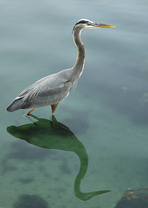 The great blue heron (below) was photographed at Lake Eola in downtown Orlando. Nothing special about the photograph itself: the bird was there and I took a properly exposed, properly focused photo of it. What is special is the Photoshopping. First, it was cropped from landscape (wider than tall) to portrait (taller than wide) orientation. Then came creating a reflection of the bird’s upper neck and head, which did not even exist in the original photo. The reflection in that area was obscured by more of that dark peat moss you see in the lower right-hand corner. The trick was to clone out the peat moss, replace it with water, select and copy the bird’s upper neck and head, flip it upside down, scale it and rotate it so it fit on the lower neck, and then use Photoshop tools to make it blend in with the reflection.