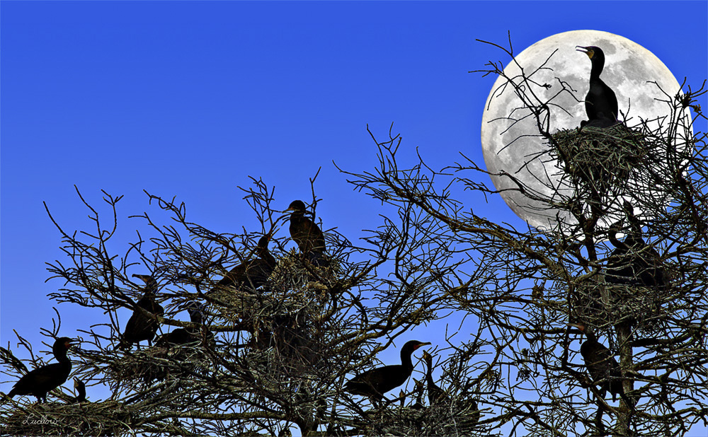 Nesting cormorants on Lake Eola, in downtown Orlando. The photo of the birds was taken in daylight, and the dark blue sky and moon were added in Photoshop.